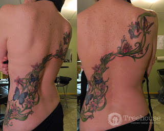 Angela came to me a few years ago to get a vine piece that filled in the gaps between some existing butterflies on her side. But this year at Treehouse we made it even bigger! Now extending from her left hip to her right shoulder, it dips, twists, and flows perfectly up and around her body. We also added design to her existing ankle piece to tie all of her tattoos stylistically together. Here's the finished piece:
